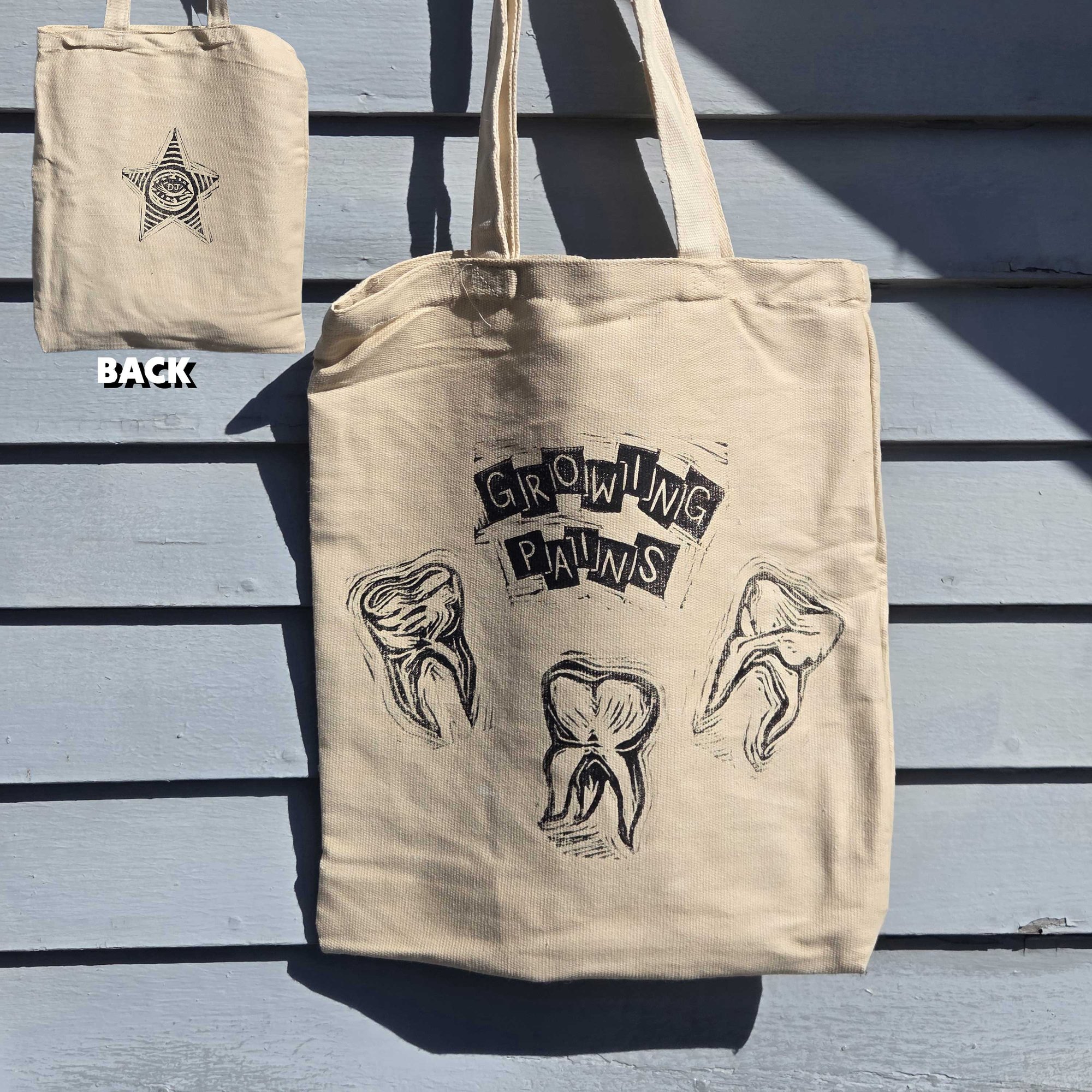 Canvas Tote Bag (13" x 15"), featuring my lino-cut designs. Other side of bag showcases my logo.